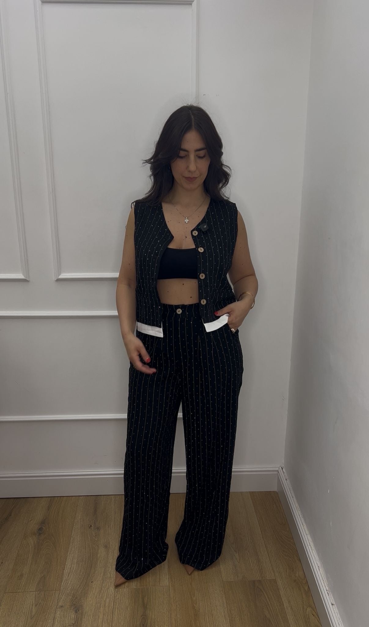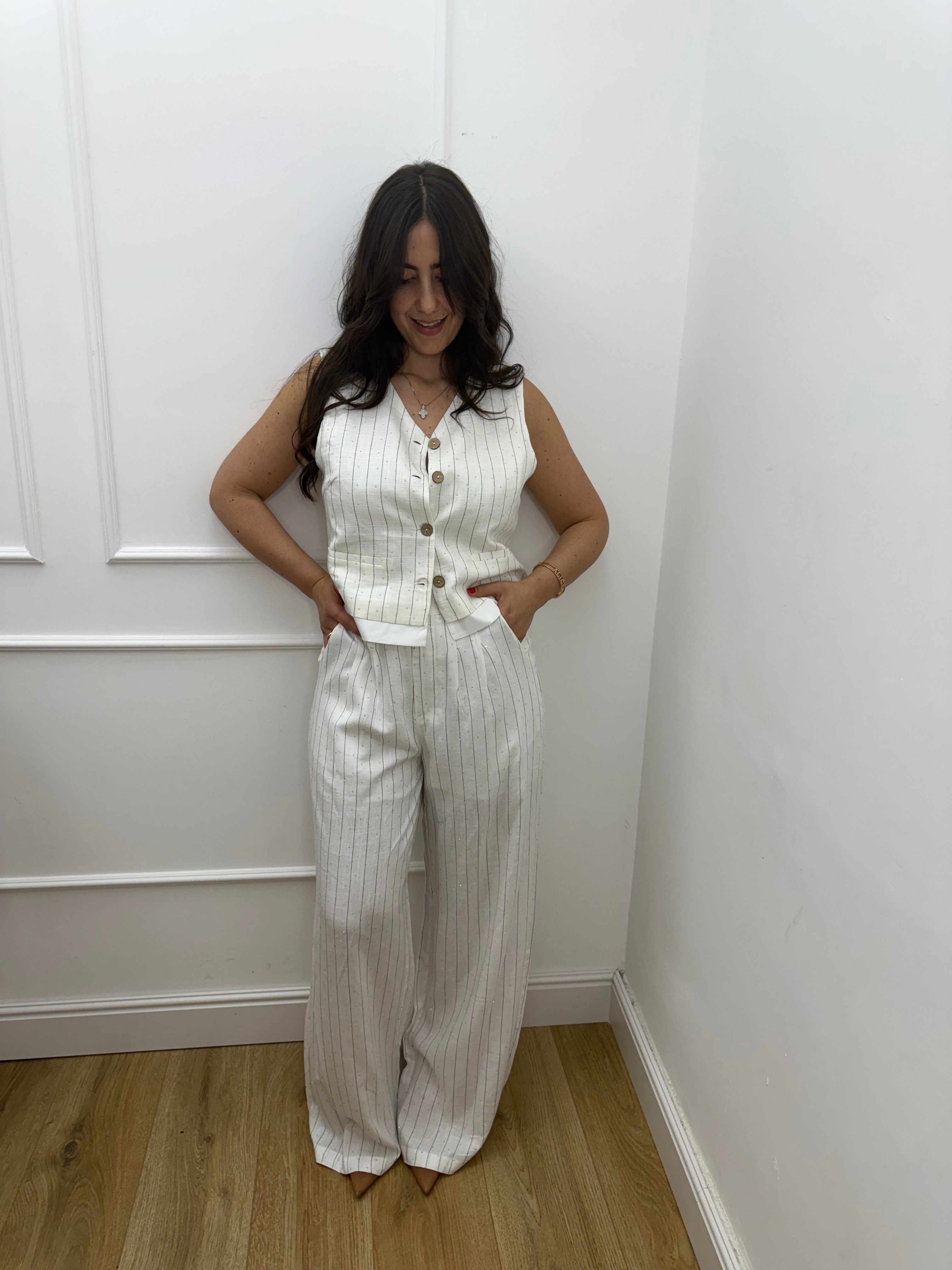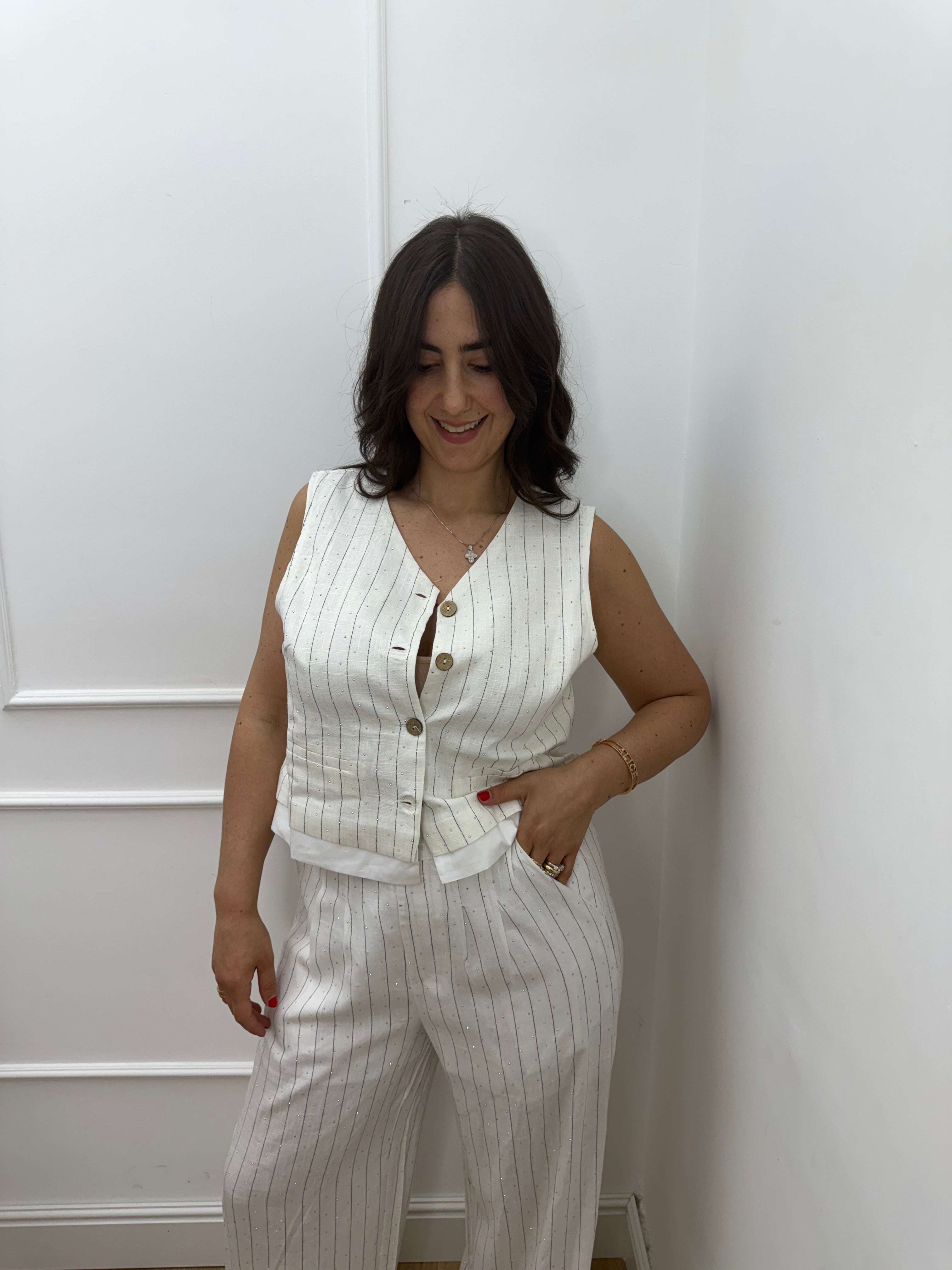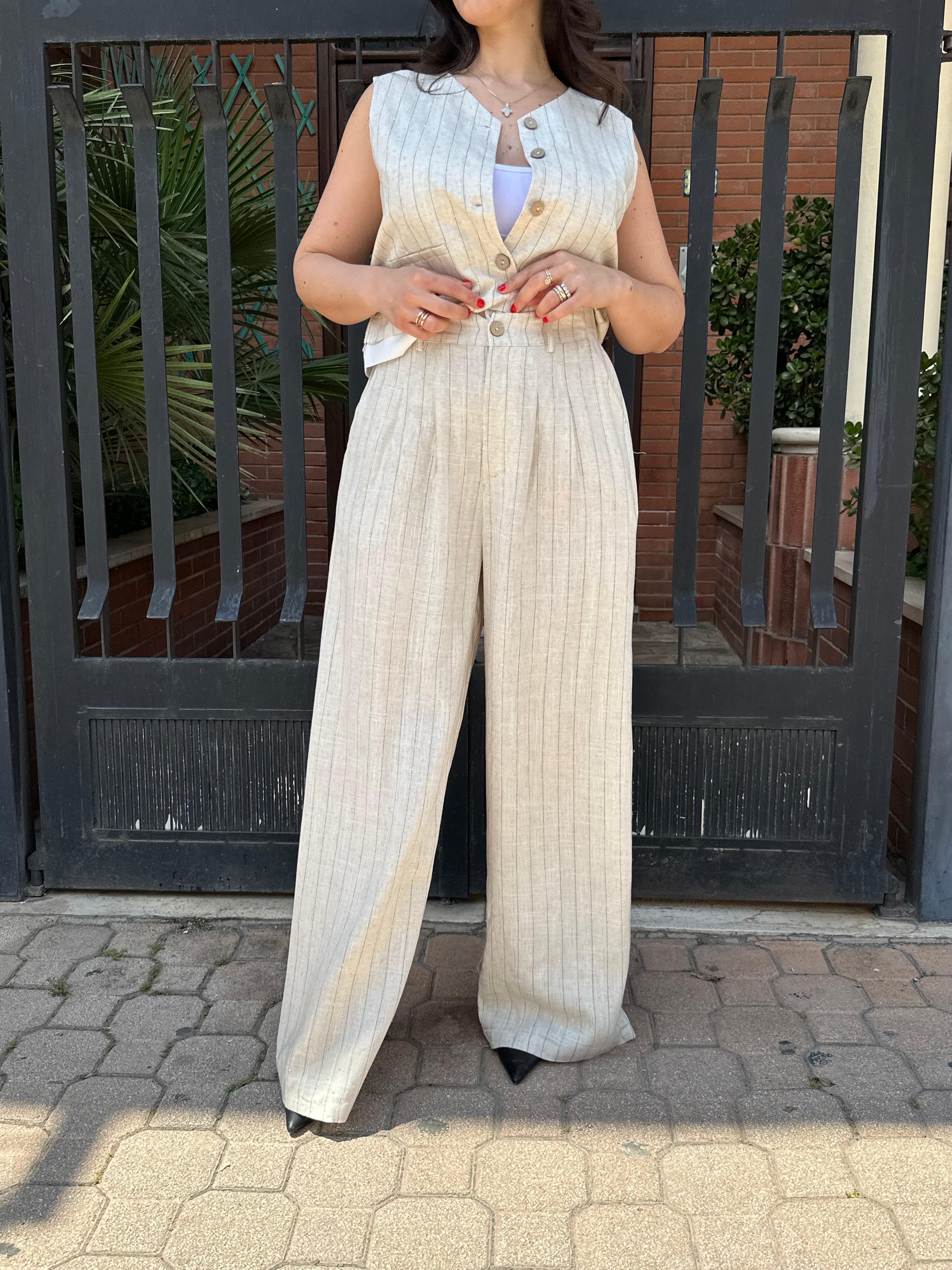 Coordinato pantalone e gilet rigato con brillantini
