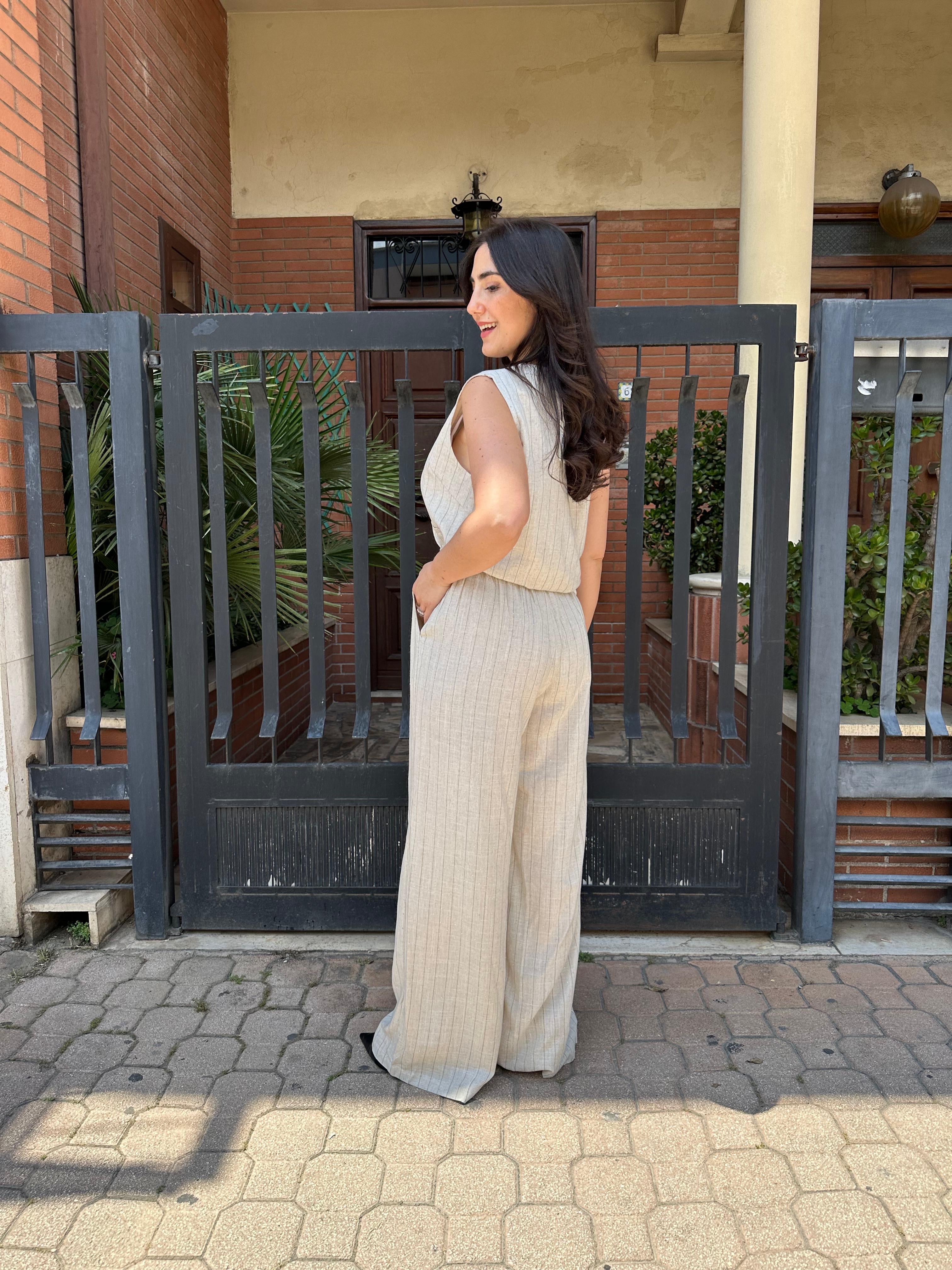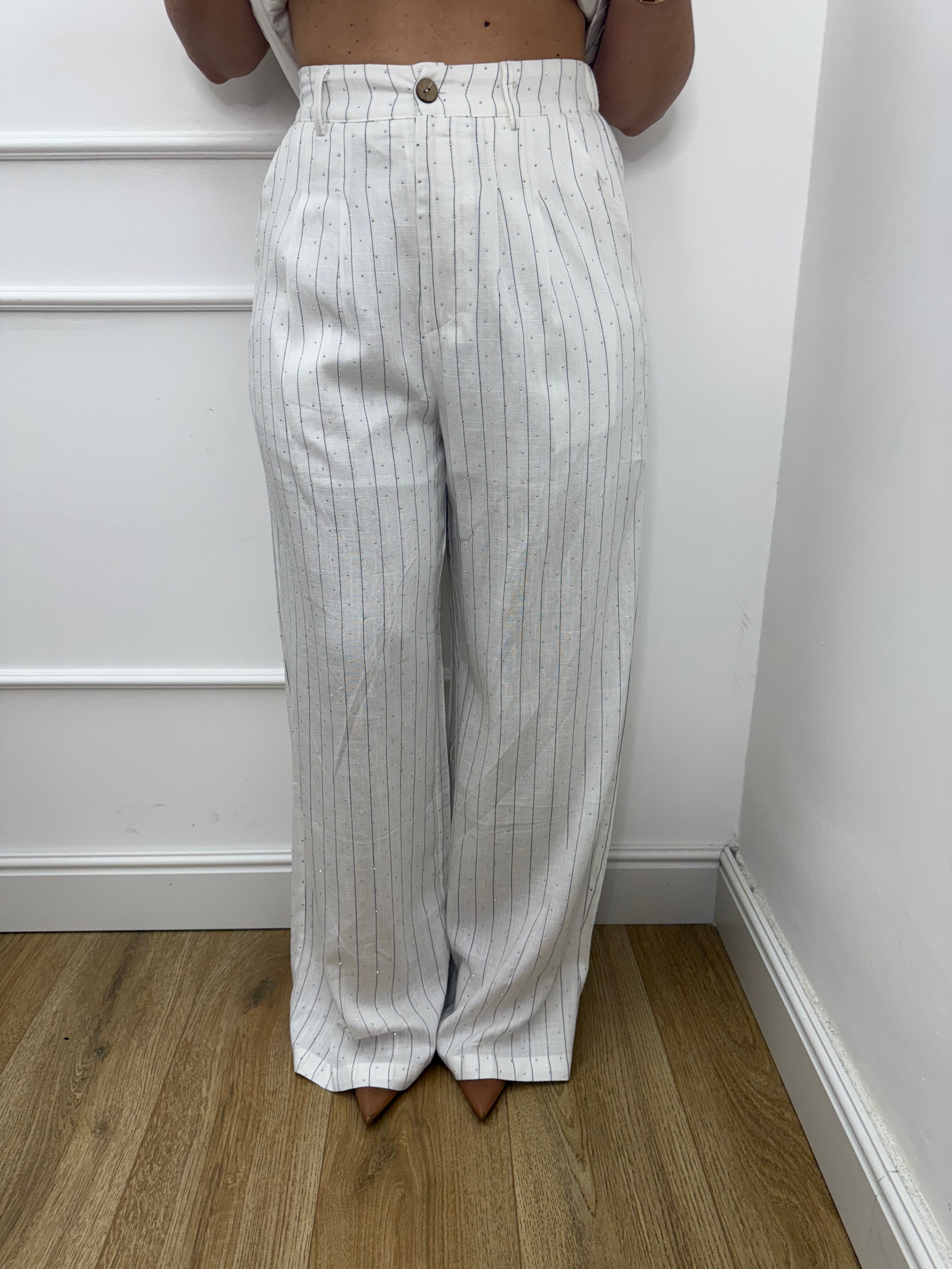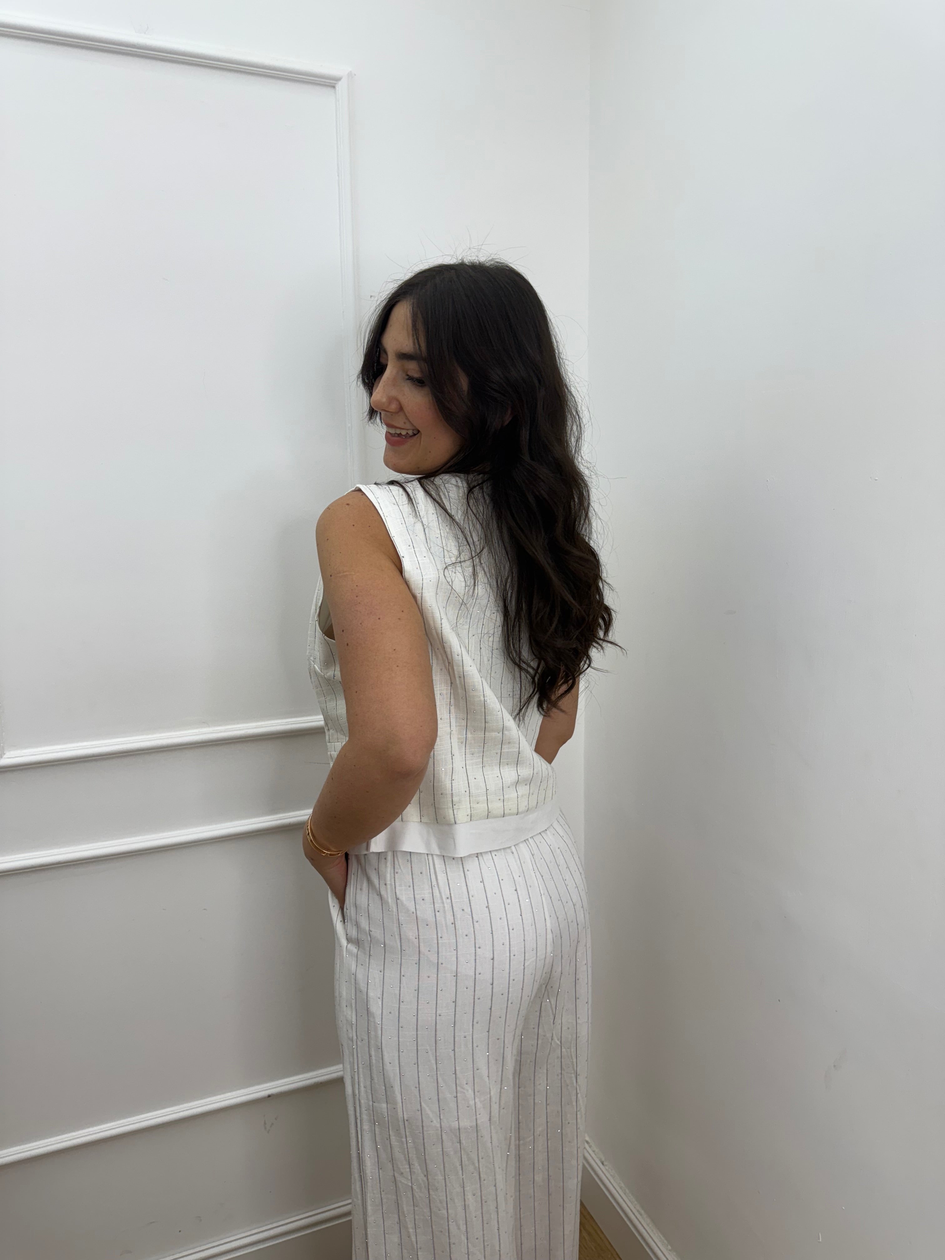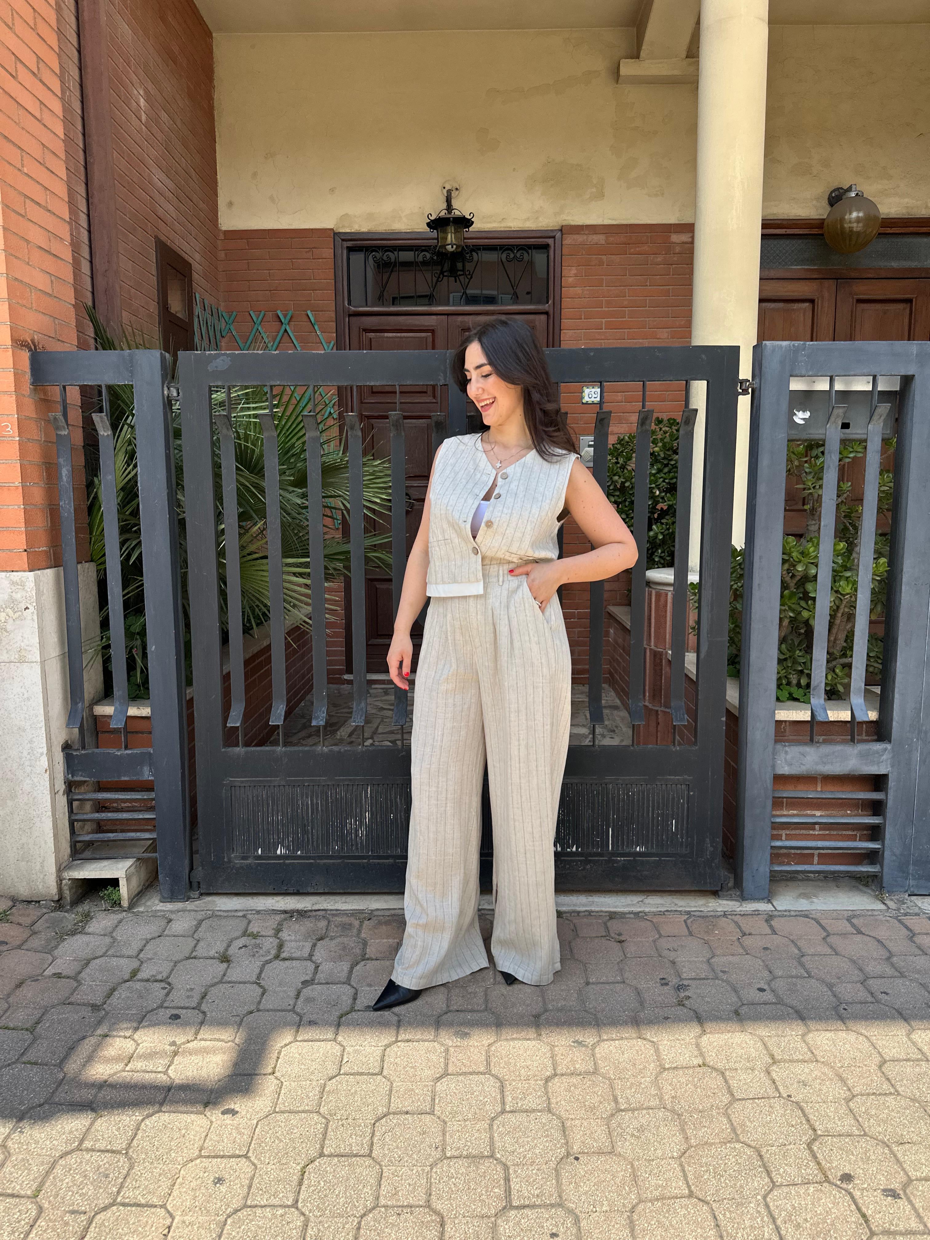 Coordinato pantalone e gilet rigato con brillantini