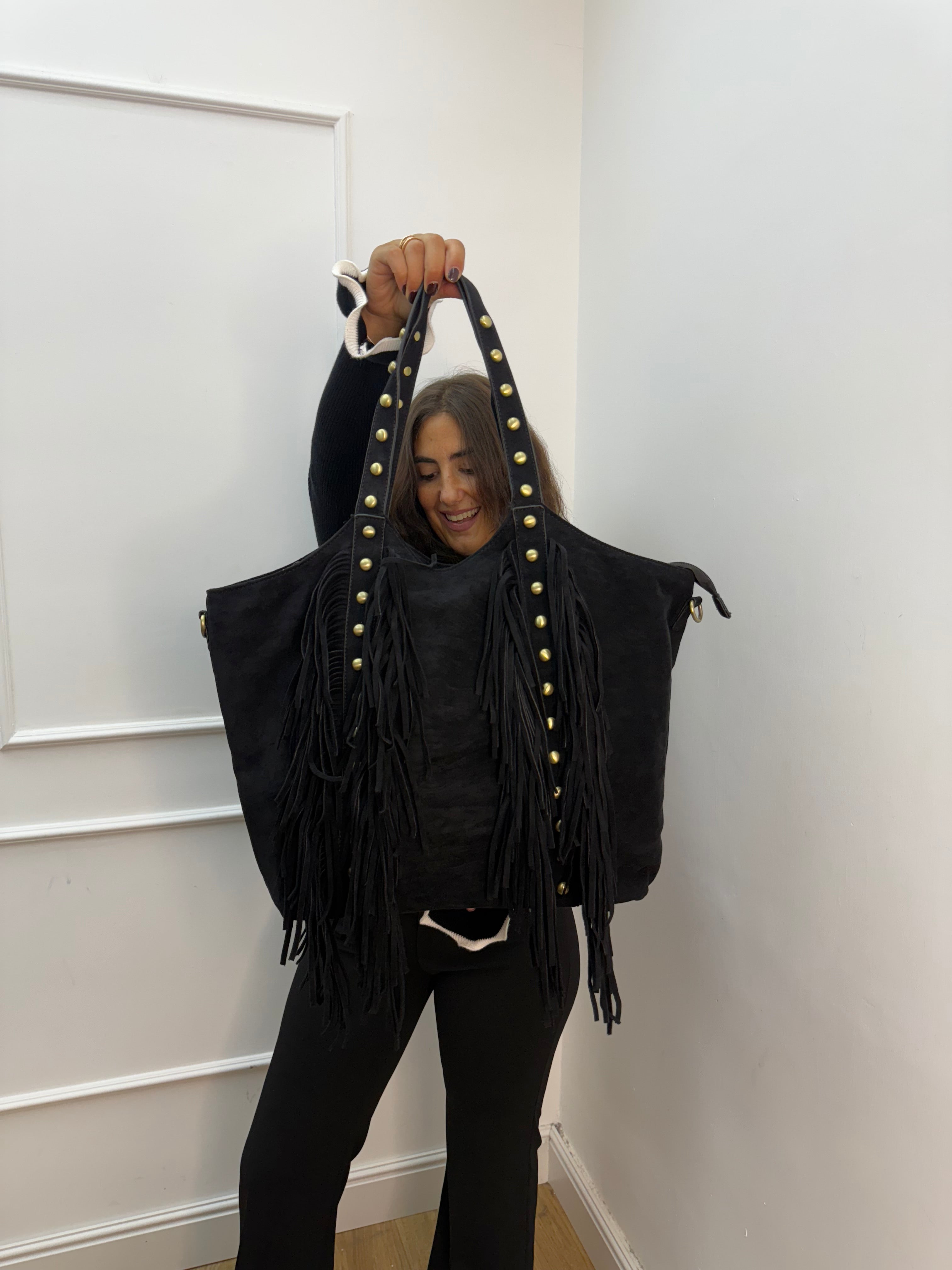 Shopper in suede con frange e borchie molto capiente e morbida