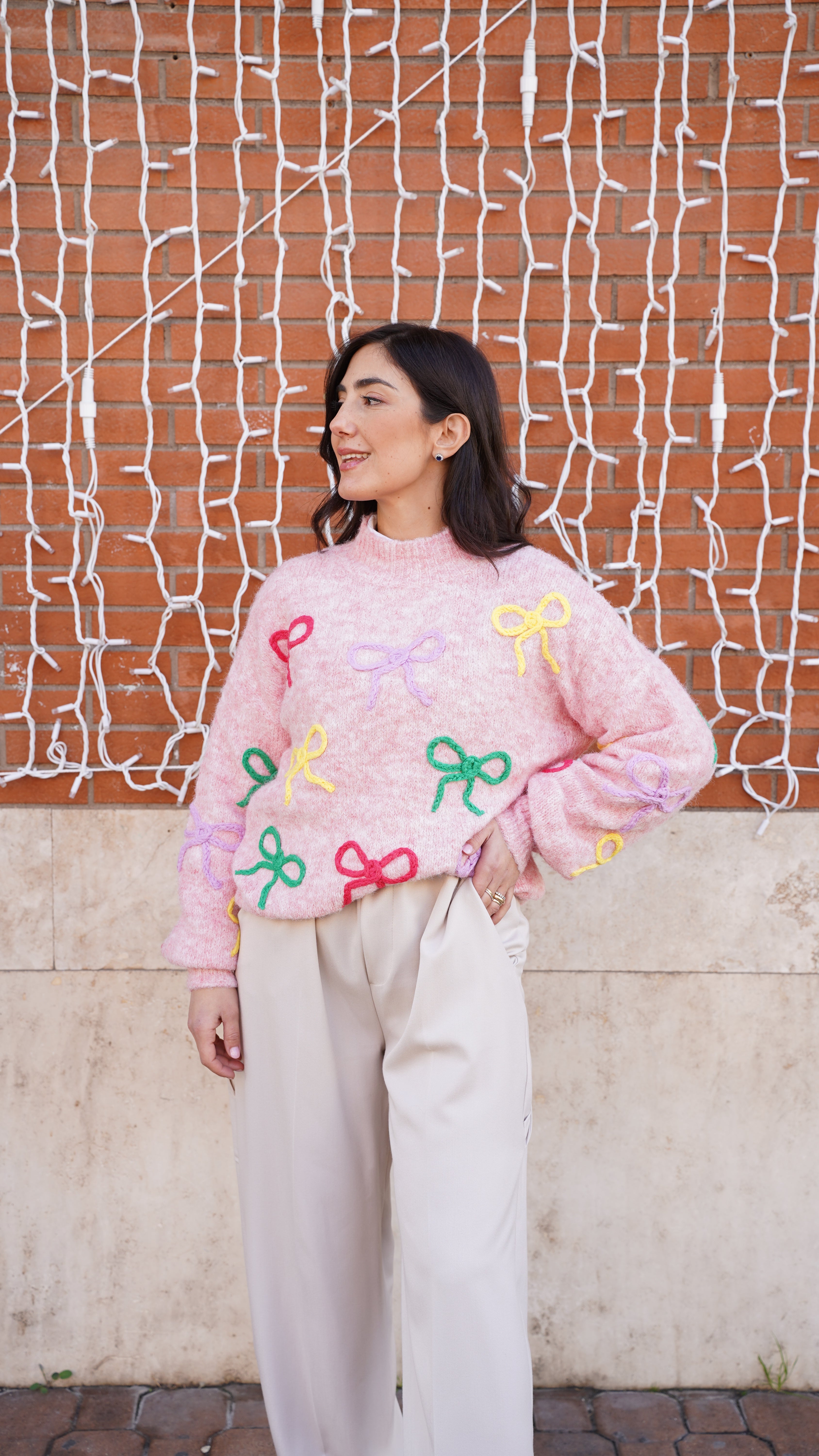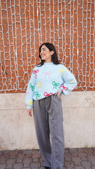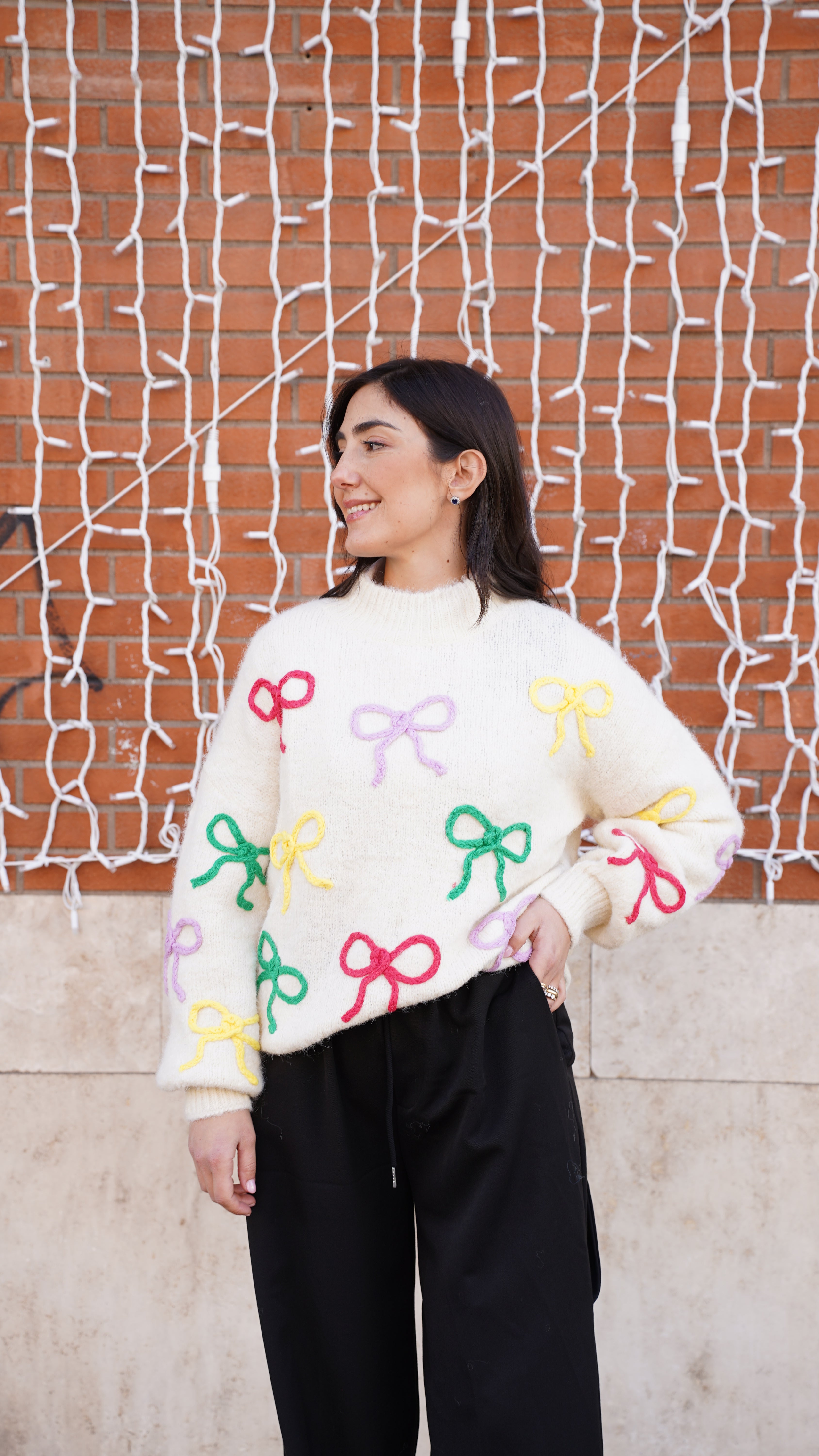 Maglione girocollo con fiocchi colorati ricamati